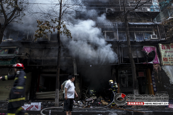 红网长沙6月23日讯(潇湘晨报记者 向佳明)6月22日凌晨5点多,长沙桔园小区居民绝大部分还在睡梦中,突然小区里叫喊声一片,原来是一家杂货店起火了。起火的地方位于桔园小区一片3栋,记者赶到现场时,大火燃烧正旺,现场至少来了5辆消防车,数十位消防队员进行灭火。大火波及了左右两侧的门面和二楼的住户,一些居民甚至衣服都来不及穿好就跑下楼来了。到上午7点,大火基本被扑灭。