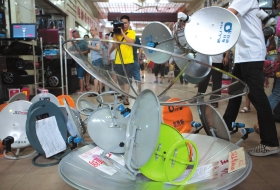 6月24日,江南商城,执法人员现场收缴部分商家非法出售的卫星电视信号接收器。 本报记者陈正摄