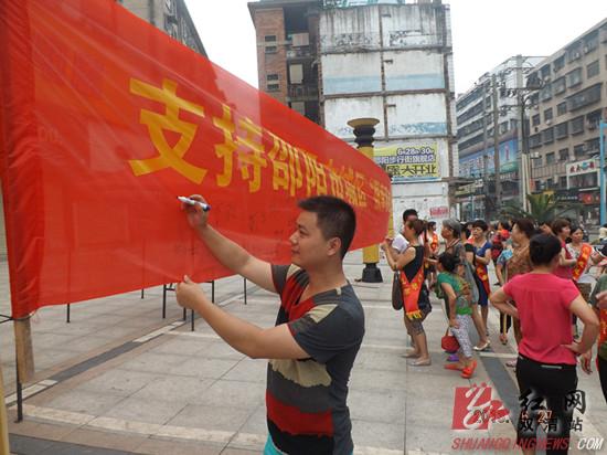红网双清站6月27日讯(分站记者 赵绍君 通讯员 肖燕) 6月27日,邵阳市双清区东风路街道办在大汉步行街开展城区“限摩限电”交通环境综合整治签名活动。办事处、社区干部及社区巾帼志愿者走上街头,为辖区居民、往来群众、摩托车司机讲解“限摩限电”整治意义及整治后政府保障措施等。随后,数百名群众在横幅上签名,表示理解与支持。
