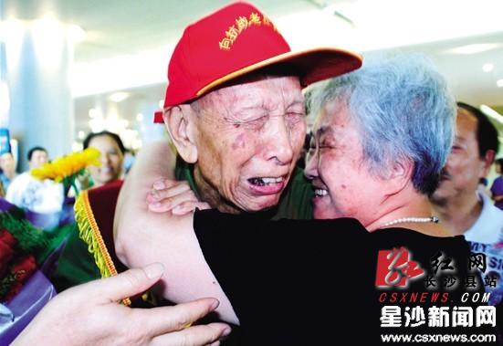 机场出口处,婧娆和她的爸爸、奶奶、叔叔、阿姨、堂哥,还有黄时玉老人一起,兴奋地等待着。下午16 时30 分,这一大家子终于见到了晚点到达的黄时弼。1 米8 几的个头,94 岁高龄的黄老依然挺拔、精神矍铄。见到堂妹,原本平静的老人喜极而泣,和妹妹紧紧拥抱在一起。福临镇工作人员不失时机打出了一条横幅:“福临人民热烈欢迎抗战老兵黄刚回家!”一位工作人员说,本来黄凤娟老人也要到机场来接哥哥的,只是不久前,她在一场车祸中被撞断了腿,目前还不能下床,只好在家里等哥哥了。