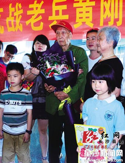 红网长沙县站7月1日讯(分站记者 何司壤)昨日下午,黄花机场国内到达出口处,和往常一样,很多人守候在这里焦急地等待着自己的家人、朋友。而人群中,有一个大家庭,心情格外激动。他们是原籍长沙县福临铺孙家桥的九旬抗战老兵黄刚的家人和来自福临镇的老乡,从7 岁的孩子到73 岁的老人,他们都遥望着出口,充满期待。今天,离家数十年的黄老终于回到了曾经只在梦中出现的家乡。