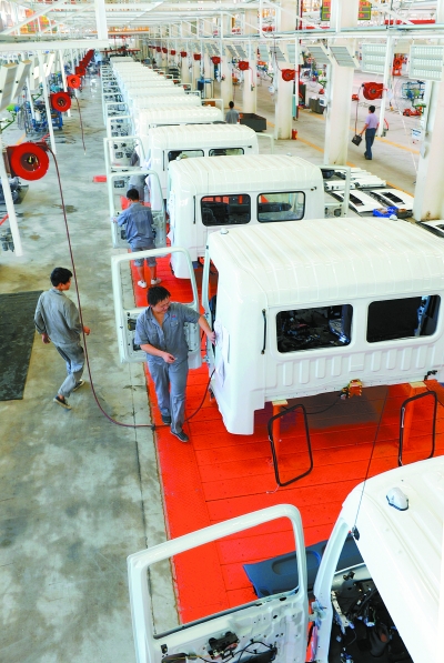 7月1日,衡阳市白沙洲工业园区内,工人在湖南华菱汽车股份有限公司总装车间进行生产作业。该公司生产的重型汽车于2012年4月正式下线,全部项目建成后将实现年产1万辆重型汽车,可实现销售收入25至30亿元,利税达2亿元。本报记者 徐行 摄