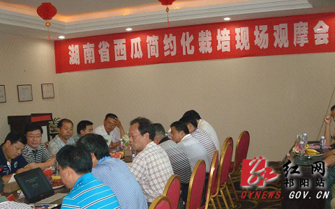 8日上午,与会人员参观了祁阳县三口塘镇丝塘、坝塘等村西瓜种植基地,该西瓜基地面积6000余亩,全部采用地膜覆盖和滴水灌溉技术,简约化程度较高,目前第三批瓜即将成熟采摘,满眼望去呈现一片绿油油的丰收景象。在随后的经验交流会议上,祁阳县做了西瓜生产典型发言,茅竹镇肖家村西瓜种植大户马春生介绍了西瓜简约化栽培技术经验。省瓜类研究所所长左蒲阳在讲话中充分肯定了祁阳县西瓜生产工作成绩,总结和部署全省西甜瓜简约化栽培技术模式推广工作。国家西甜瓜产业技术体系邵阳试验站站长邓大成研究员最后还作了南方西甜瓜简约化栽培技术讲座。
