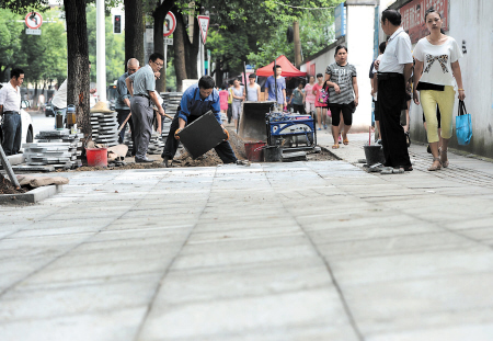昨日上午,记者在湘雅路的整治现场看到,园林工人已将花坛里的绿化植物全部移除,再一块块地铺上透水砖,造型和旁边的人行道保持一致。现场的一位工作人员告诉记者,这些花池是13年前建的,里面多是些稀稀拉拉的小灌木,一些不文明的市民时常丢些垃圾在里面,很难清理。过宽的花坛使得人行道变得特别狭窄,一些路人不得不走到机动车道上,给交通“添堵”。不久前,开福区委书记李蔚在该区进行城市环境检查时要求对湘雅路重点整治,保护好行道树,合理配置绿化,还路于民。