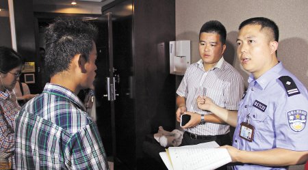 在重阳路,民警来到华晶宾馆前台,就派出所“民警提示”房间张贴以及住客身份信息登记情况进行抽查。在三楼,经过入住登记台账和房间住客的现场核实,未发现漏登;当民警来到另一家名为圣蔓萝的商务酒店,在前台,民警发现应张贴在显眼位置的“民警提示”没有张贴,当即要求前台工作人员进行张贴。在605房间,当民警发现入住该房间2人只登记了一人的身份信息。民警就此与一旁的酒店负责人进行确认,并要求接受相应处罚,同时责成酒店将“民警提示”贴入该客房。