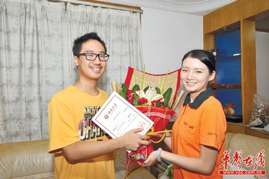 7月11日上午,长沙市左家塘,邮政速递物流工作人员将长沙市首封重点院校录取通知书及鲜花送到汤济之同学手中。记者 田超 摄
