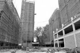 628岁的古银杏树,如今夹在高楼之间,因受建筑废水废料污染,根系已被严重破坏,显得叶落根枯。 本版摄影本报记者刘平