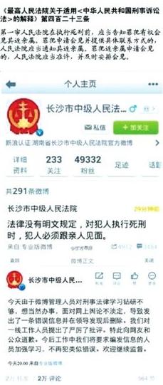 面对质疑,昨天下午,长沙市中级人民法院在其官方微博发布消息称:“法律没有明文规定,对犯人执行死刑时,犯人必须跟亲人见面。”这则消息再次引发网友的热议,被批“冰冷回复”。半小时后,长沙市中级人民法院将此条微博删除,并发微博道歉及解释,称微博管理人员对刑事法律学习钻研不够,已提出严厉批评。