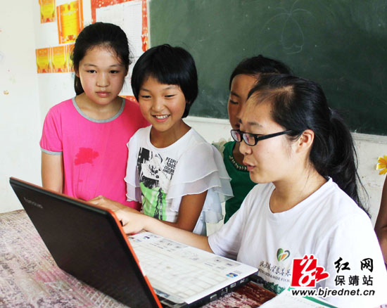 大学生志愿者为留守儿童传授电脑知识。