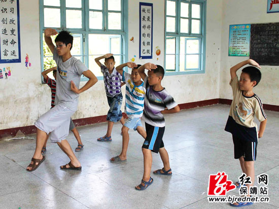 大学生志愿者给留守儿童教武术。