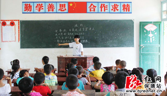 大学生志愿者给留守儿童教歌曲。