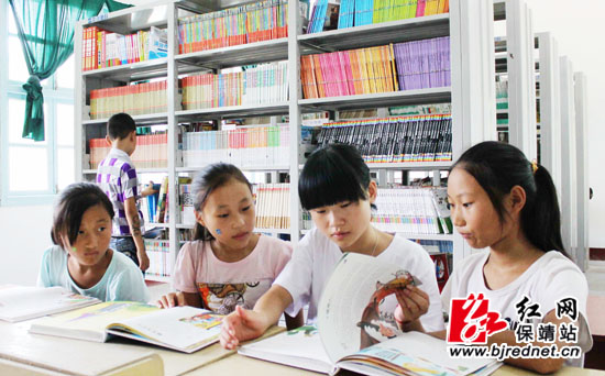 大学生志愿者指导留守儿童阅读图书。