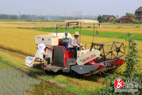 红网攸县站7月15日讯(分站记者 文亚春)7月13日,烈日当空、热浪逼人,在攸县上云桥镇七里坪村的稻田里,一台联合收割机正在来回穿梭为农户收割稻谷,同时,一辆拖拉机正忙着运载刚收割下来的稻谷回晒场,不远处的水田里,几位农妇正在弯腰插秧。攸县已经全面进入抢收抢种水稻高潮。