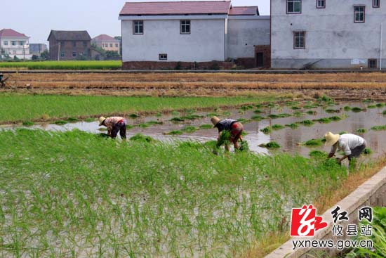 农妇弯腰插秧,用手织出夏季的新绿