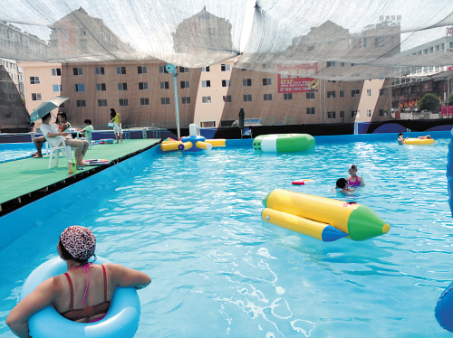 昨日下午,记者来到实地查看。杉木冲东路一家大型卖场的前坪,用挡板围了一个大圈,挡板上画有一些动漫图案,入口处写着“红星动漫水上世界”。门口的工作人员介绍:“成人票价40元,小孩30元,网上团购一律26元,还可以办月卡、VIP卡。”记者表示想先参观一下环境,一名邱姓工作人员带记者进入。场内环境和网上的“实拍”照片比相去甚远,用钢结构和尼龙布撑起两个约四五百平方米的水池,分别为深水池和浅水池。除了两个充气滑梯外,几乎没有什么像样的游乐设施,只有4个小型充气玩具。10多名孩子在游泳,他们对这些充气玩具几乎碰都不碰。“孩子看了网上的图片,说特别想来玩水上漂流,我们大老远赶过来,才发现根本没有,简直坑爹!”泳池边一名家长说。记者就此询问工作人员,邱先生说:“不好意思,有的设施坏了,送去检修了。”