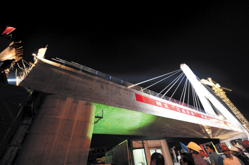 本报今晨讯(记者 章盛莉)今日凌晨1时03分,记者在高铁长沙南站以南约2公里的沪昆高铁上跨京广高铁施工现场看到,一座重达1.45万吨的斜拉桥经过30分钟的高空转体,在逆时针旋转21°后,与两端桥体成功合龙。这标志着沪昆高铁杭长湖南段线下工程全部完成,为9月底前开始铺轨创造有利条件。这也是全国首例高铁跨高铁的转体斜拉桥。