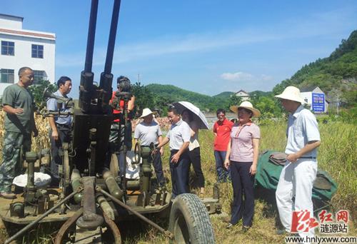市委副书记、市长谢学龙(右二)在白马镇人工降雨点察看。
