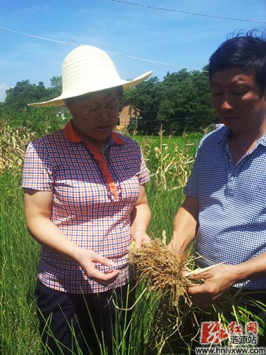 谢学龙在茅塘镇藕塘村田间察看农作物。(肖莺 摄)