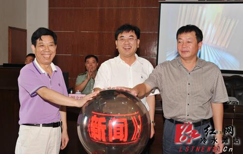市委宣传部副部长兼市社科联主席蒋三立、永州电视台副台长罗水生和冷水滩区委书记杨军元共同为冷水滩新闻栏目开播启动触摸球
