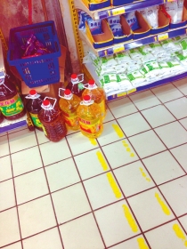 7月30日,步步高国安店生活超市消防卷帘下方放着几瓶油。 本报记者曹伟摄