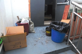七星潮流购物公园内垃圾桶、垃圾袋等杂物被堆在了消防通道内。 本报记者邓昊摄
