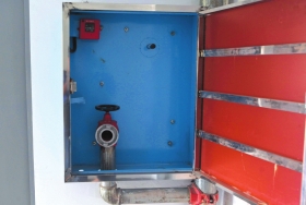 在4楼美食广场最南侧电梯附近一个安全出口,门后有一个消防栓,不过,打开后发现没有水带和喷头。