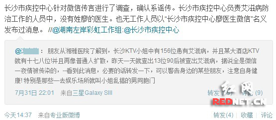 红网长沙8月2日讯(记者 董雷 通讯员 谢丹)近日,不少市民在微信群聊中发现一条抬头为“链接长沙市疾控中心廖医生微信”的消息,称“湘雅医院检测长沙KTV小姐中有156位患有艾滋病”,8月2日,长沙市疾病预防控制中心就此事进行了回应,确认系谣传,内容不实。
