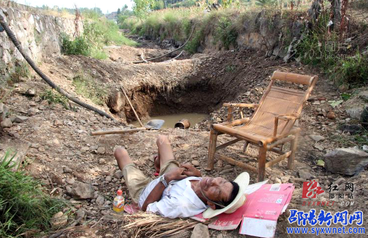 8月2日,邵阳县五峰铺镇东山村村民刘克西连续12昼夜睡守在江底砂凼旁等待抽汨水救1.7亩中稻,2小时的积水只够抽5分钟。(李爱民 摄)
