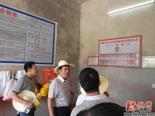 涟源市人大常委会主任梅国华(左二)在三甲乡农民抗旱服务队的抗旱物资储备室,详细询问抗旱救灾情况。(刘志毅 摄)