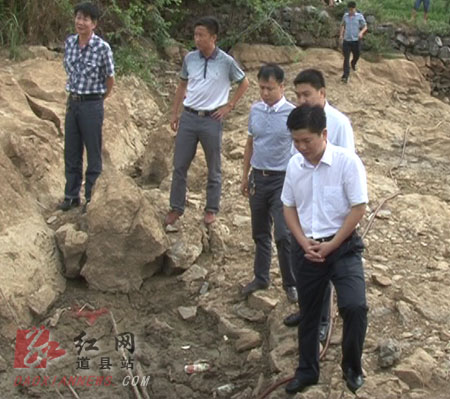 图为县委副书记、县长秦志军实地查看乐福堂乡甘塘坪村干涸的山塘。