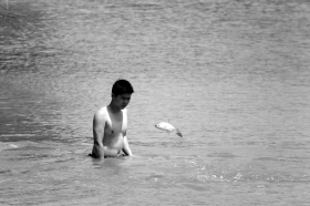 8月4日,长沙县湘峰村,一名养鱼户望着水面“飞”起的一条鱼。该鱼塘边缘部分已经见底,养鱼户担心持续的晴热高温天气,鱼儿会被逐渐干死。 本报记者刘有志摄