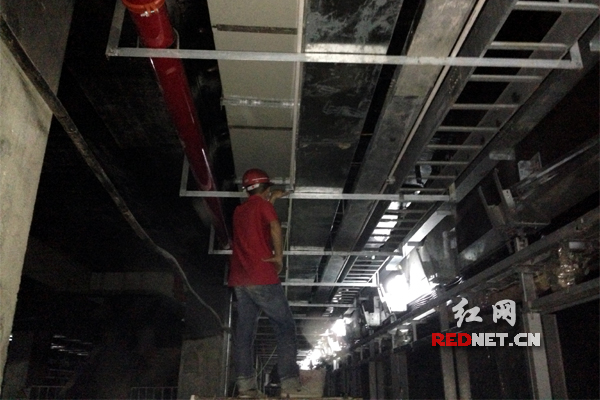 8月3日下午,长沙地铁2号线芙蓉广场站施工人员安装通风和空调设备。