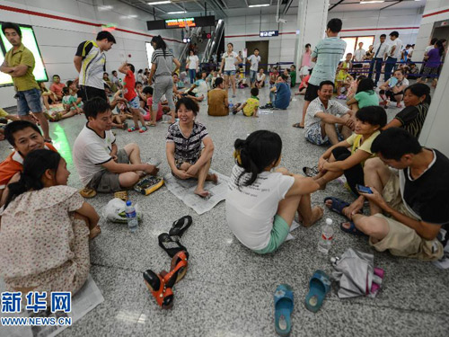7月25日,周边居民在杭州乔司地铁站内纳凉。当日,杭州最高气温再次突破40摄氏度。由于余杭区乔司街道部分地区6时至22时停电,数百名周边居民进入附近的杭州地铁1号线乔司站内纳凉(图片来源 新华社)。