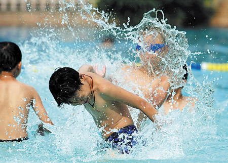 火星街道兴湘国际酒店游泳池,两名小“候鸟”在享受游泳的惬意。贺文兵 摄