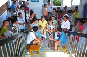 8月5日,天元区原师专附中旧址内,外来务工人员子女新生报名现场,工 作人员在维持秩序。 本报记者邓昊摄