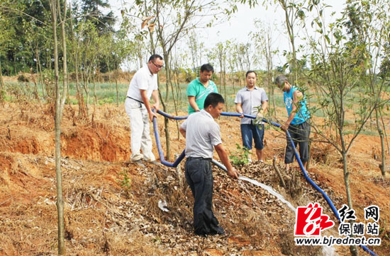 红网保靖站8月6日讯(通讯员 龙凤云)针对当前高温少雨、旱情持续发展、未来降雨仍可能持续偏少的严峻形势,保靖县林业局8月1日组建了3个抗旱保苗应急分队,全力启动魏竹路段和格则湖水库周边抗旱保苗行动。魏竹路和格则湖周边是保靖县2013年八百里绿色行动两处植林造景点,共栽种有10万株珍贵苗木。魏竹路绿化北起酉水二桥桥头南至岳阳桥头,总长度2.5公里,主要使用珍贵的乔木树种和观景树种进行绿化;格则湖水库周边绿化,以环格则湖水库公路的绿化为主线,在沿线空地打造“八园”即“桂花园”、“紫薇园”、“桢楠园”、“杨梅园”、“紫荆园”、“樱花园”、“红枫园”、“红豆杉园”。图为保靖县林业局干部职工在格则湖水库周边“八园”中的桂花园给桂花大苗浇水。