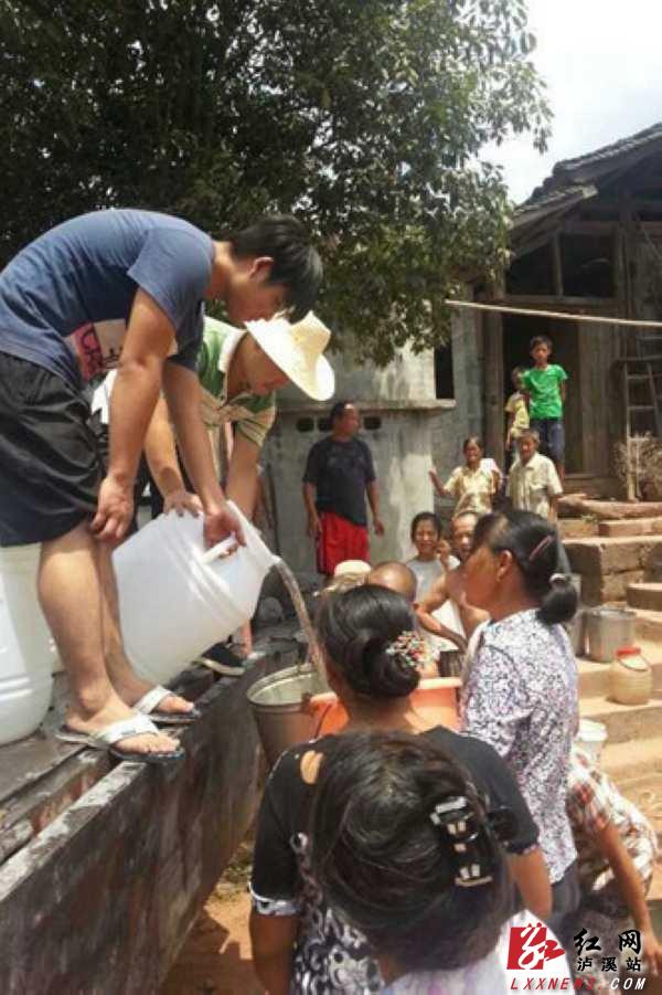 洗溪镇邓家坪村李尧溪自然寨本有390余人80余户人,现在家人口只有90余人,多为老人和小孩。通往李尧溪虽有村道却路途遥远,从村部楼至该寨大约有15公里。现该寨已无干净水源,90余人饮水极其困难。镇政府买来60瓶桶装水,派车将水送至李尧溪。由于在家的人多为老人和小孩,他们根本拿不动一大桶矿泉水,若是倒入小桶中一点点提,不仅浪费了干净的水还让老人、小孩反复要走很多路。抗旱应急小分队9名小伙子赶到了现场,他们扛起了一桶桶矿泉水,走过小道绕过荆棘,把水送到了农户家中,43户农户全部喝上了干净的水。