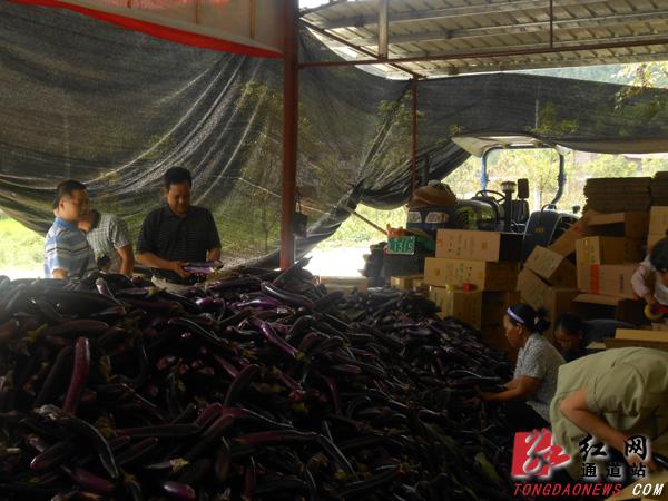 通道县侗寨蔬菜种植专业合作社红茄示范种植基地的农民正在忙着为长茄分检装箱