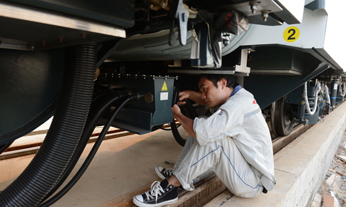 一位技术人员正在检查车厢线路。本报记者 徐行 摄