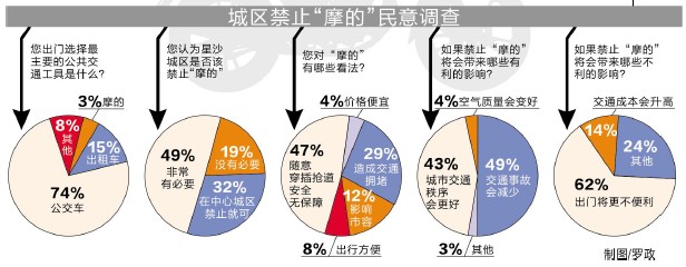 而对“摩的”的看法,76%的市民认为“摩的”随意穿插的行为给交通安全造成了影响。92%的市民认为如果禁止“摩的”,星沙城区的城市交通秩序将有所好转。而62%的市民表示,如果禁止“摩的”,出行将不便。