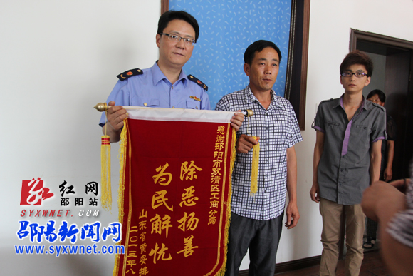 陷入传销组织的山东菏泽市东明县的黄茂松被解救后,其父亲黄安排送上锦旗表示感谢。