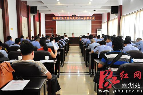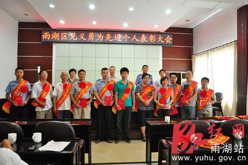 红网雨湖站8月10日讯(分站记者 李灿)8月9日,雨湖区召开见义勇为先进个人表彰大会,通报2012年度见义勇为奖励基金募集情况,表彰2012-2013年度见义勇为先进个人,部署2013年度见义勇为工作。会上授予郭丹、陈建湘、周磊等15位同志为“湘潭市雨湖区见义勇为先进个人”荣誉称号。