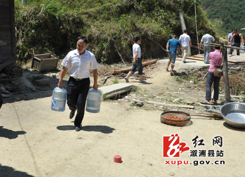 在舒溶溪乡竹坡坳村,了解到村支部书记杨祖易为寻找水源扭伤了脚,仍坚持组织村民开展生产自救时,李卫林给予了肯定。“大爷,我来帮您吧。”