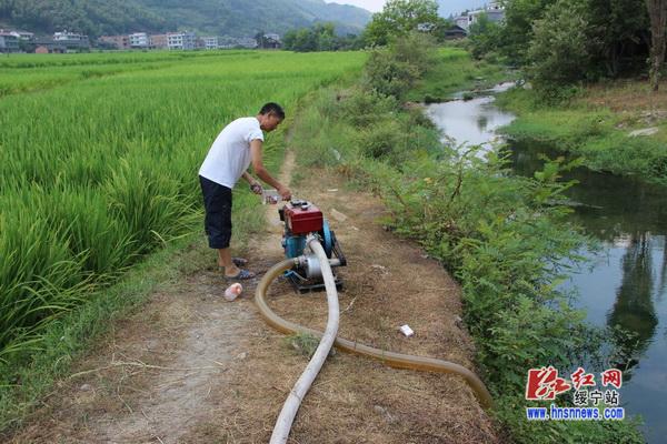 红网绥宁站8月14日讯(通讯员 向云峰)8月13日下午,在绥宁县瓦屋塘乡新桥村拱桥边,五组村民贺元培正守在河堤上的一台抽水机。见到机子没油了,就赶紧拿出旁边的柴油桶给机子加油。在桥下的同样一台柴油机也在轰隆隆的响着,河水源源不断地沿着管道输往附近干渴的杂交水稻制种田。一旁的县人大代表、新桥村村委会主任袁华东告诉我们,每天早上,他都要给每台用于抽水的柴油机送去一桶柴油,确保抽水不中断。