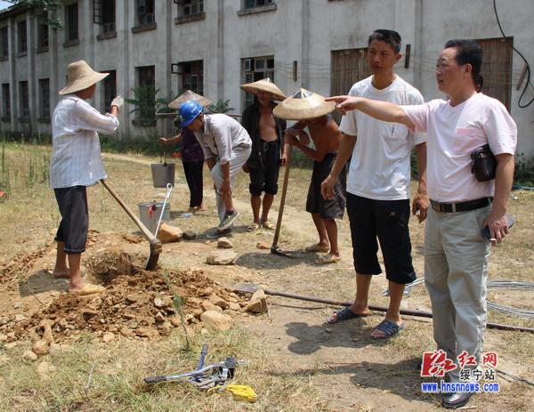 在新桥村一个山坡上,邵阳市物资行管办主任刘小明带着驻村工作组,指挥瓦屋塘供电所职工和当地村民竖立电杆,架设电线。刘小明介绍说,已竖好5根电杆,正在架线,今下午就可以搞好,用于抽水可以解决300多亩制种田的灌溉。据了解,邵阳市物资行管办目前上班的有7名干部,这次驻村就来了5人,留下两人值守办公室,带来抗旱资金5万元,通过购买抽水设备、拉通电线,组织村民抽水灌溉。驻村工作组在抗旱中做到“三个确保“,即确保580亩种子田不因干旱而绝收;确保用水和谐、用电安全、社会稳定;确保与村民同吃同住同劳动,不增加村里负担。