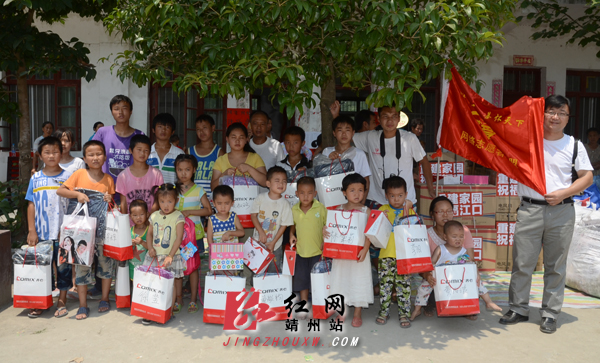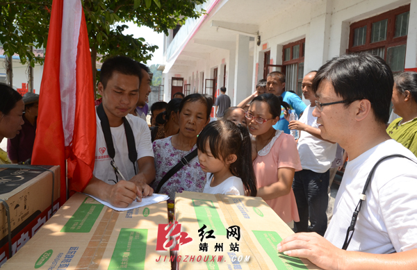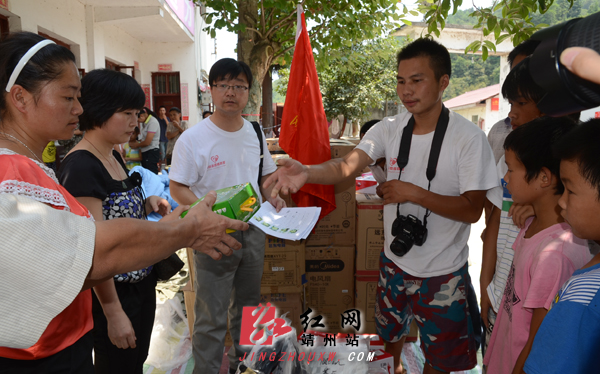 红网靖州站8月14日讯(分站记者 龙本亮 通讯员 陆通志)8月13日,怀化新闻网总监、网络志愿者联盟会长曾照宇与网络志愿者一起,将爱心团体与企业、个人捐助的物品送到寨牙江口火灾临时安置点。把电风扇,学习用品,衣物等发到灾民和小朋友手上。