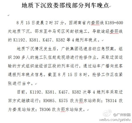 红网邵阳站8月15日讯(分站记者 李慧兰 通讯员 张阳)8月15早上6点52分,邵阳市火车站接上级调度命令:受娄邵线塌陷影响,8月15日,邵阳至衡阳的T8314次、娄底至永州的8631次、永州至娄底的8632次、邵阳至长沙的T8306次、南宁至宁波的K582次停运,持有这5列火车车票的旅客可到邵阳市火车站售票厅办理全额退票手续。同时,邵阳火车站将暂停发售车票。