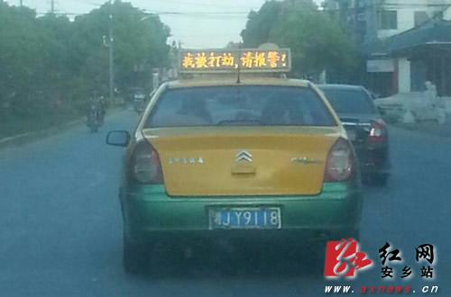 LED灯上显示“我被打劫,请报警!”的出租车