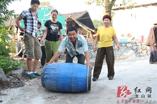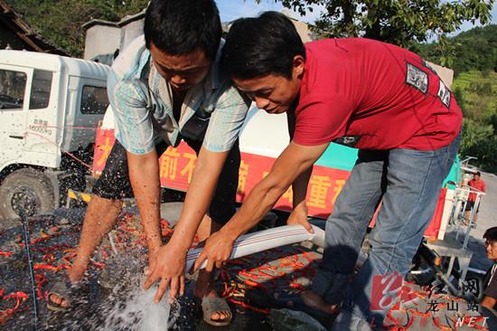 “各位村民,中联重科的洒水车到了,赶快接水来!”8月13日下午17时6分,村主任杨爱民拿着喇叭放开嗓子喊,令人振奋的声音在大山里不断扩散,不时还有阵阵回响。不一会儿,早有准备的村民们背着背笼、提着水桶、拿着不同的盛水器具围了上来。