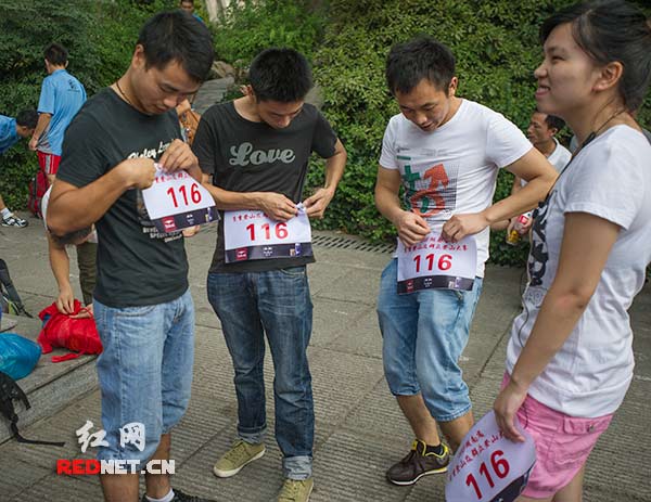 (登山比赛开始前,选手们将参赛号牌挂在身上。)